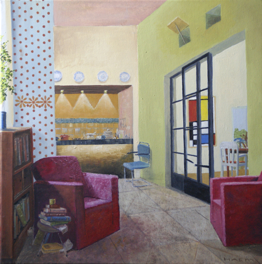 Interieur is mijn onderwerp. Olieverf schilderijen van places to be met een individueel karakter. De persoonlijke inrichting met hier en daar een werk van een bekende of minder bekende kunstenaar.