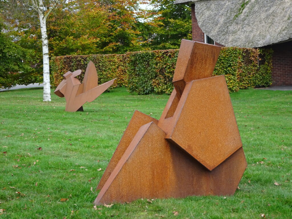Naast rechte strakke lijnen worden er ook strakke gebogen lijnen toegepast. Het (bronzen) beeld Queen is hier een goed voorbeeld van.